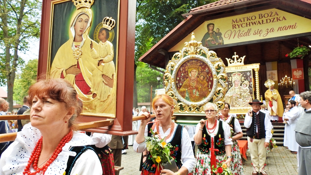 Na przełomie XVII i XVIII wieku kult Matki Bożej Rychwałdzkiej rozszerzył się poza granice ziemi żywieckiej, a nawet poza granice państwa polskiego. 2 lipca 1756 roku bp Franciszek Potkański z Krakowa konsekrował nowy murowany kościół i przewodniczył wprowadzeniu Cudownego Obrazu, który umieszczono w nowym ołtarzu. 18 lipca 1965 roku odbyła się uroczysta koronacja Cudownego Obrazu. Dokonali jej kard. Stefan Wyszyński i abp Karol Wojtyła.
