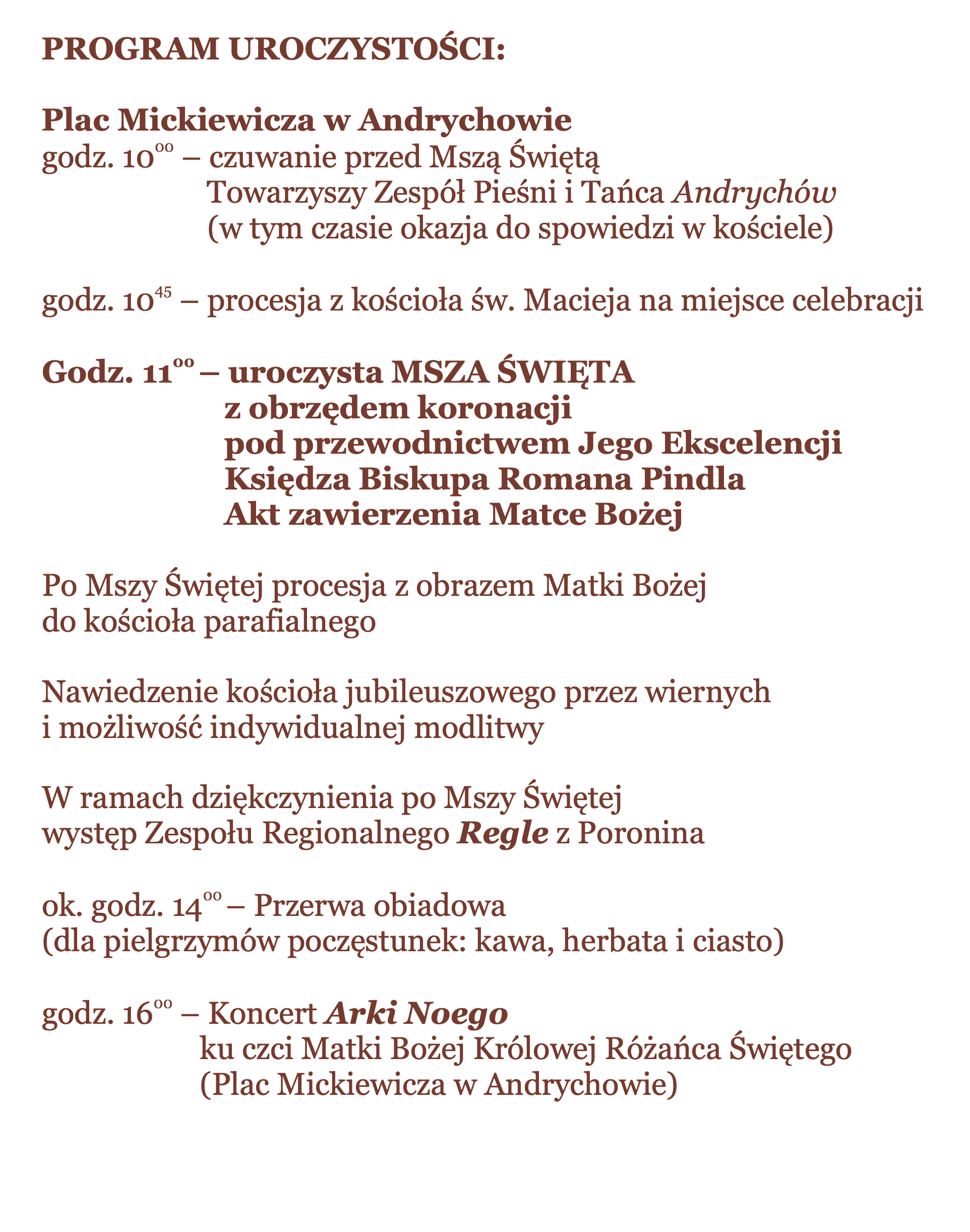 Zakończenie roku katechetycznego będzie miało miejsce w Parafii Św. Macieja w Andrychowie podczas uroczystości Koronacji Koronami Papieskimi Obrazu Matki Bożej Różańcowej Pani Andrychowskiej w sobotę, 21 czerwca 2025 roku o godzinie 10.00.