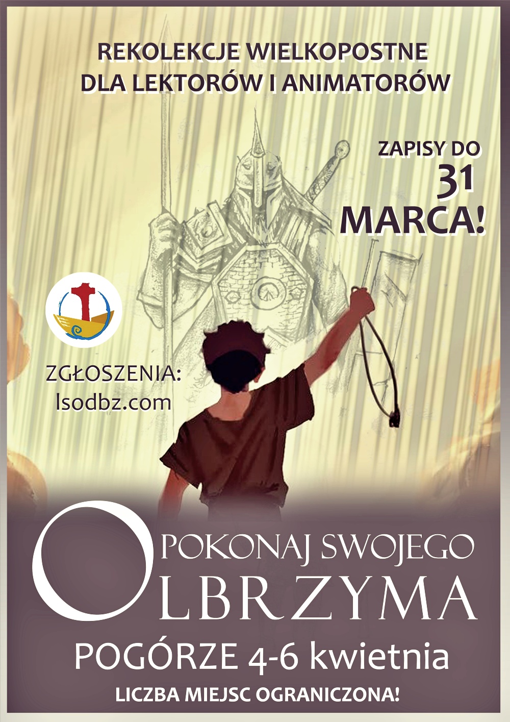 Serdecznie zapraszamy do udziału w rekolekcjach wielkopostnych dla lektorów i animatorów „Pokonaj swojego olbrzyma”. Być może martwią Cię coraz bardziej piętrzące się przed Tobą trudności? A może nie przeżywasz dużych zmagań z problemami, ale frustrują Cię przeszkody i niezrealizowane marzenia? Tematyka konferencji będzie dotyczyła tym razem strategii rozwiązywania problemów w codziennym życiu. Szczególnym adresatem zaproszenia są tegoroczni lektorzy oraz animatorzy ustanowieni w ubiegłym roku, a także ministranci (min. 7 klasa).