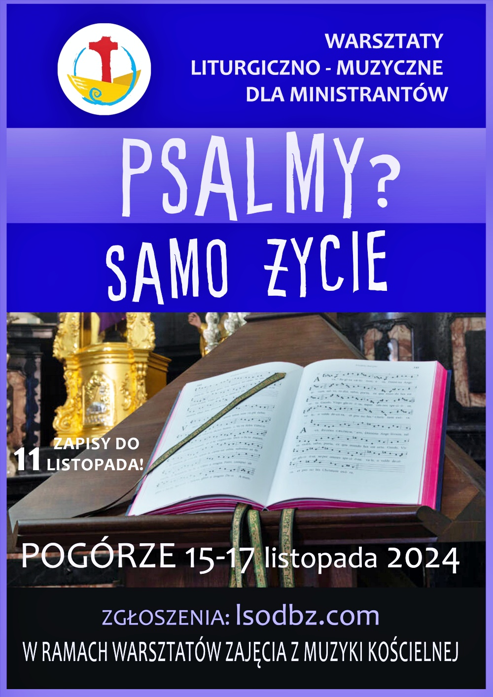 Serdecznie zapraszamy do udziału w warsztatach muzyczno-liturgicznych „PSALMY-SAMO ŻYCIE” dla ministrantów, lektorów i animatorów. Spotkanie jest adresowane dla tych, którzy chcieliby rozpocząć posługę śpiewu psalmów w czasie Eucharystii, jak i dla tych, którzy pragną poszerzyć swoje umiejętności. W ramach warsztatów odbędą się zajęcia z muzyki kościelnej z organistami. Nie zabraknie również konferencji, które pomogą odczytać Księgę Psalmów. Zapraszamy ministrantów od IV klasy szkoły podstawowej, którzy posiadają predyspozycje potrzebne do podjęcia posługi śpiewu psalmów.
