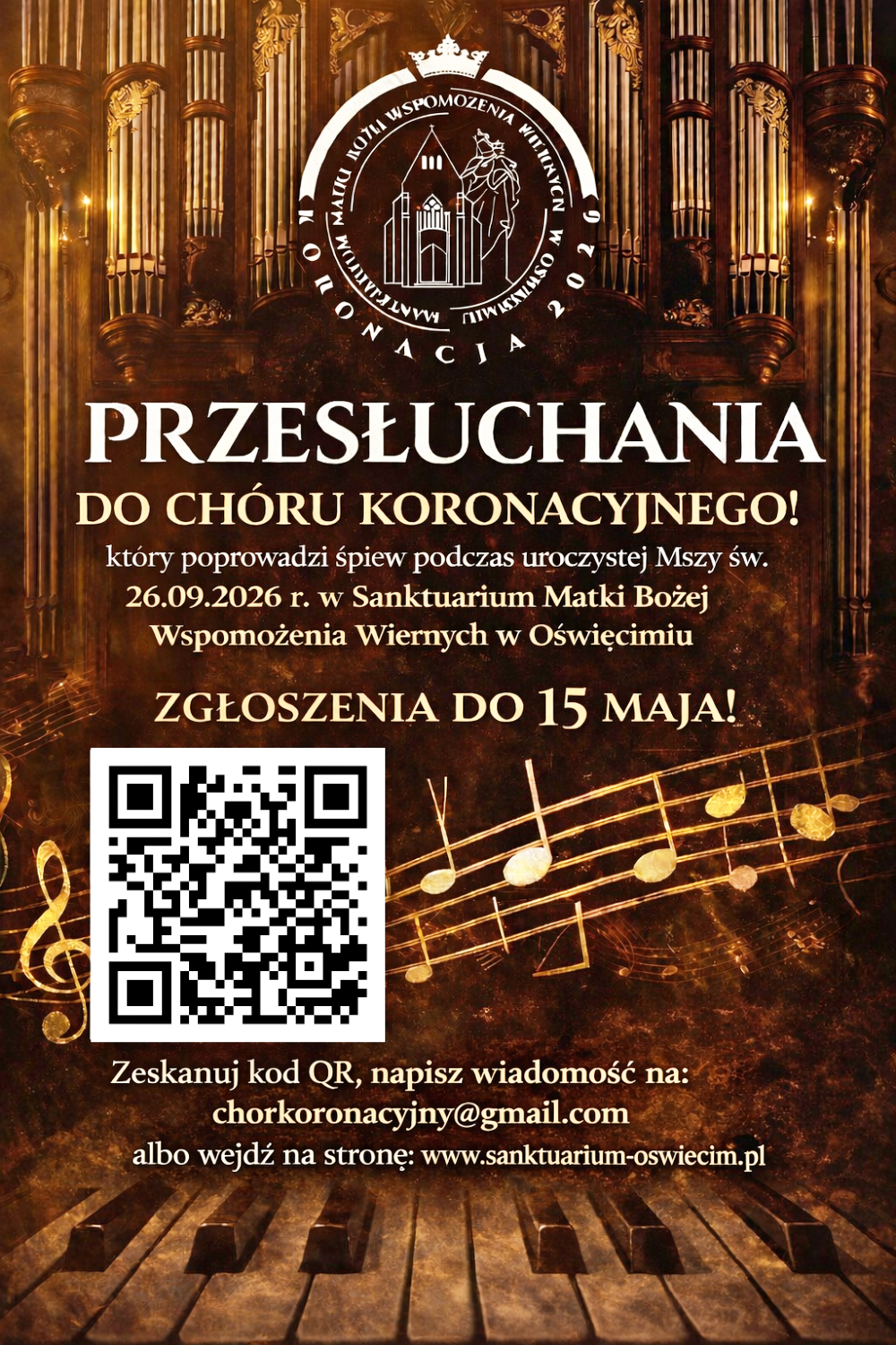 W Sanktuarium Matki Bożej Wspomożenia Wiernych w Oświęcimiu rozpoczął się nabór chętnych osób, które potrafią śpiewać, do włączenia się w śpiew w chórze koronacyjnym. Zespół ten stworzony będzie na potrzeby uroczystości koronacji wizerunku Jezusa i Matki Bożej Wspomożenia Wiernych, która odbędzie się 26 września 2026 r. pod przewodnictwem ks. bpa Romana Pindla.