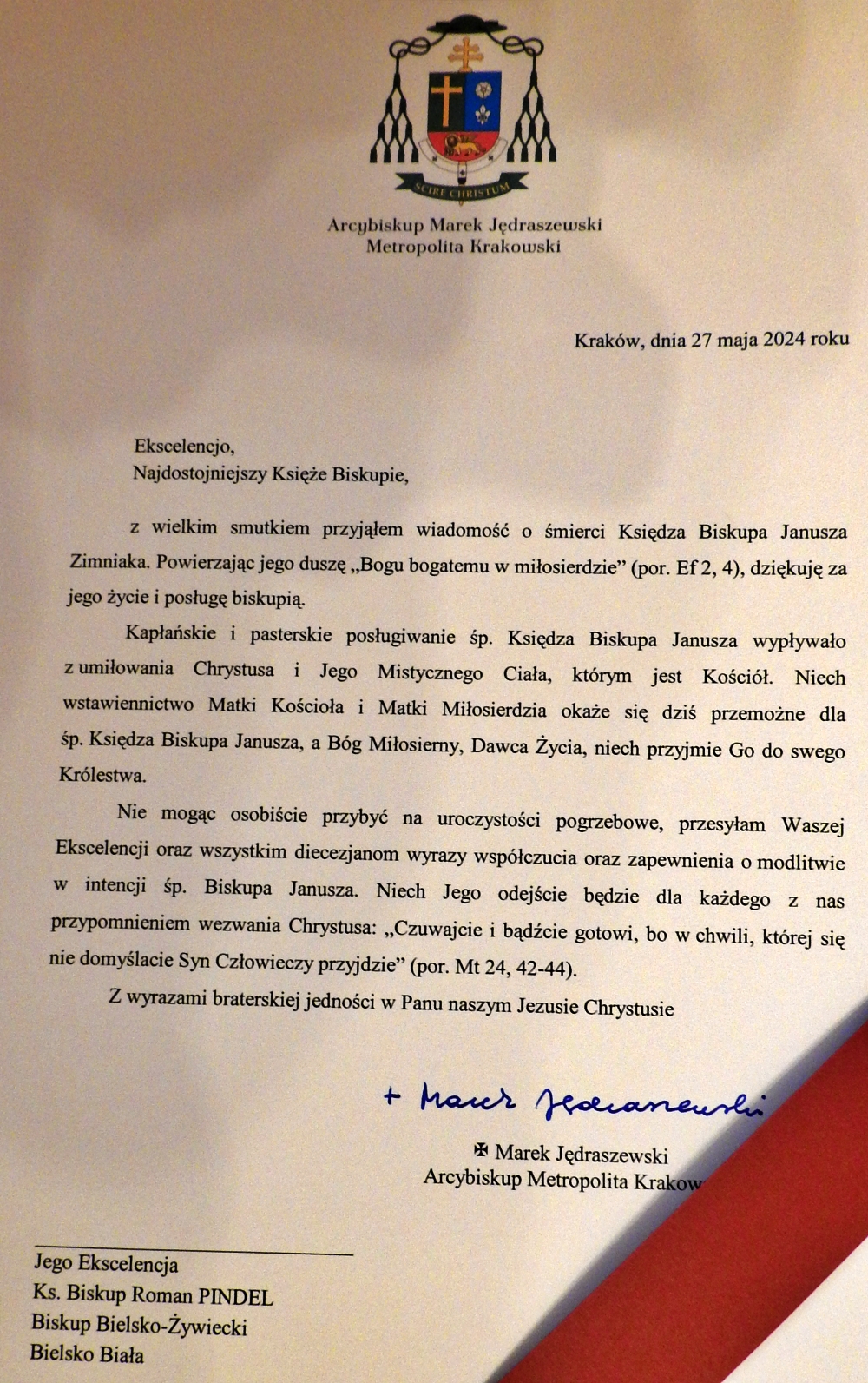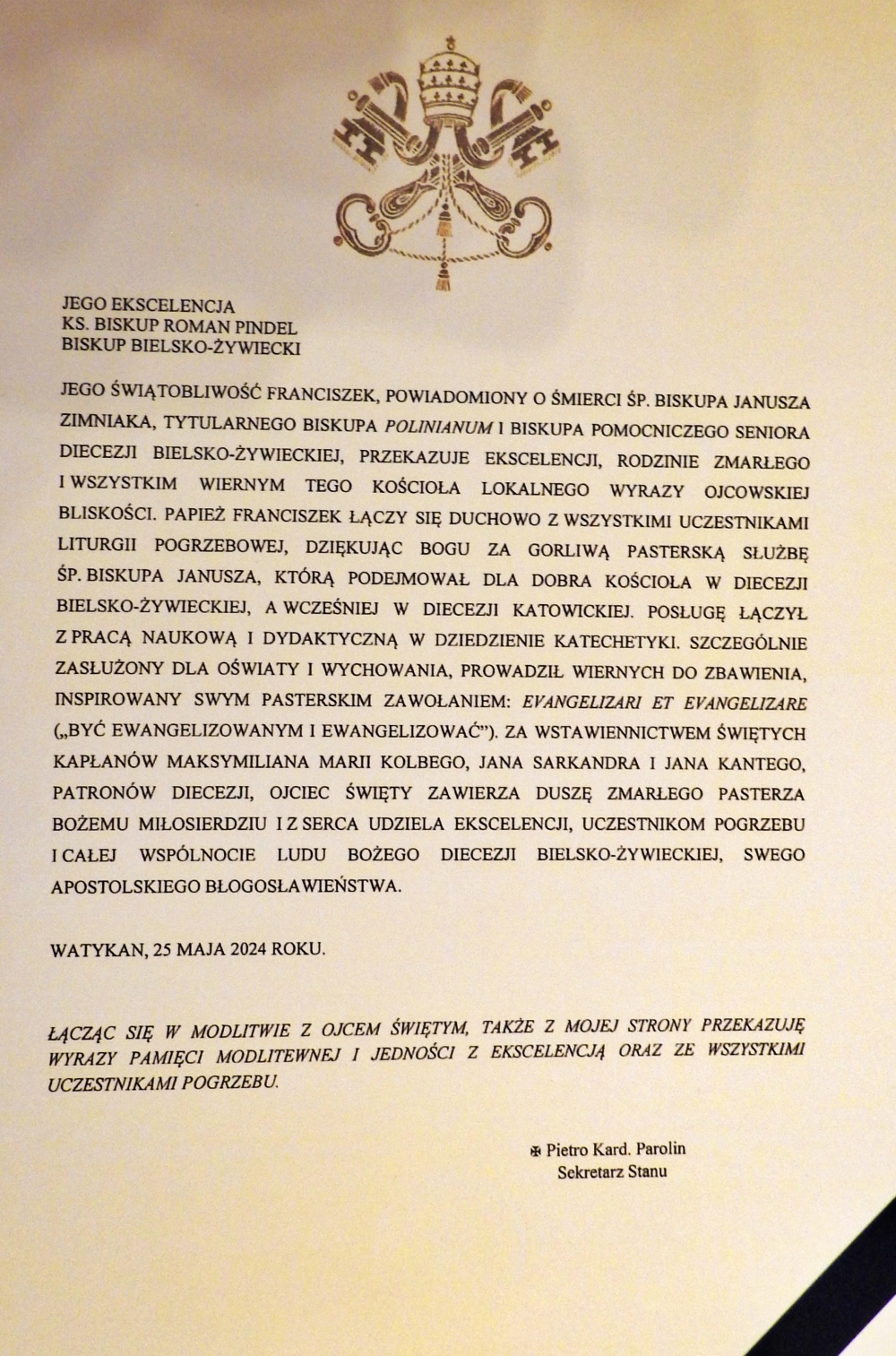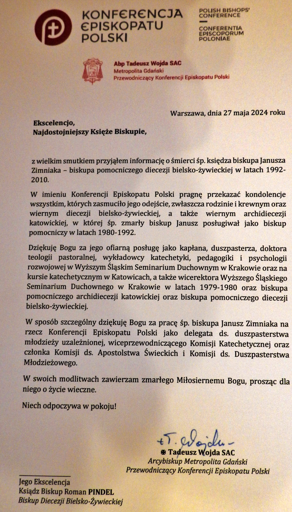Kardynałowie i biskupi uczestniczyli 31 maja 2024 r. w katedrze w Bielsku-Białej w uroczystym pogrzebie biskupa pomocniczego seniora diecezji bielsko-żywieckiej Janusza Zimniaka. Ciało duchownego, który przeżył 90 lat, w tym 44 jako biskup i 68 jako prezbiter, spoczęło w grobie zasłużonych kapłanów na bielskim cmentarzu przy ul. Grunwaldzkiej. Mszy św. pogrzebowej przewodniczył kard. Kazimierz Nycz. Wspólnie z metropolitą warszawskim nad trumną zmarłego hierarchy modlili się m.in. kard. Stanisław Dziwisz oraz arcybiskupi Adrian Galbas i Wiktor Skworc, a także biskupi: Roman Pindel, Piotr Greger, Zdzisław Fortuniak, Jan Kopiec, Grzegorz Olszowski, Paweł Socha, Marek Szkudło, Adam Wodarczyk.