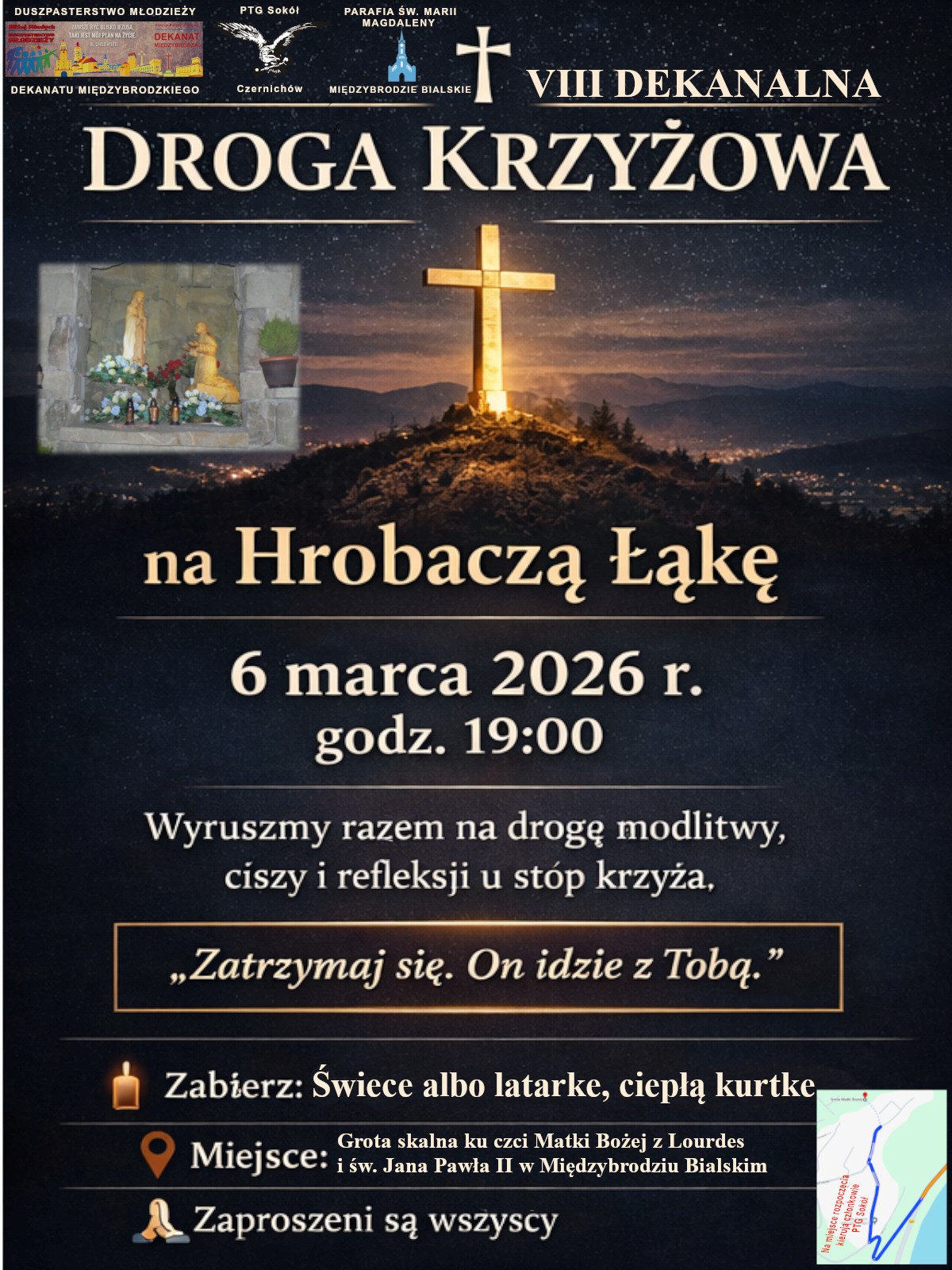 Dekanalne Duszpasterstwo Młodzieży wraz z grupą PTG Sokół organizuje Drogę Krzyżową na Hrobaczą Łąkę z Międzybrodzia Bialskiego. W piątek (06.03.) o 19:00, a od godziny 18:00 oznakowani członkowie PTG Sokół będą kierować na parkingi. Szczegóły na plakacie.