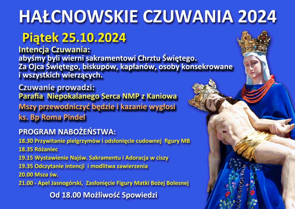 W piątek, 25 października, odbędzie się kolejne Hałcnowskie Czuwanie. Podczas tego spotkania w sposób szczególny wierni modlić się będą o wierność sakramentowi Chrztu Świętego, za Ojca Świętego, biskupów, kapłanów, osoby konsekrowane oraz wszystkich wierzących. Modlitwom przewodniczyć będzie parafia Niepokalanego Serca NMP z Kaniowa. Mszę św. o 20:00 sprawować będzie bp Roman Pindel, który wygłosi również homilię. W programie: różaniec, adoracja w ciszy, modlitwa zawierzenia. Możliwość skorzystania z sakramentu spowiedzi od godziny 18:00.