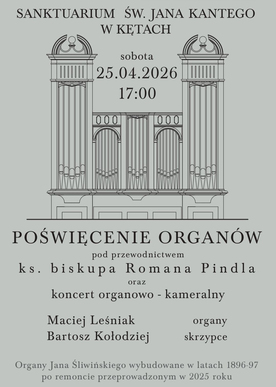 W sobotę, 25 kwietnia o godz. 17.00 odbędzie się uroczyste poświęcenie organów w sanktuarium św. Jana Kantego oraz koncert muzyki organowo-kameralnej. Poświęcenia dokona biskup Roman Pindel, a wykonawcami koncertu będą Maciej Leśniak (organy) i Bartosz Kołodziej (skrzypce).